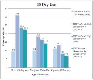 For our area, three substances emerged as potential problem areas: Alcohol, Tobacco, and Marijuana. With 32.8% of youth reporting that they’ve used alcohol within the past year, it is the most used substance within our area. Our area’s 30-day cigarette use (11%) is higher that both the state and national averages. In the span of two years, marijuana’s perception of harm has fallen 12%, and the perception of availability has increase; this would leave us to believe that in the future, the percentage of youth using will also increase if left unaddressed.